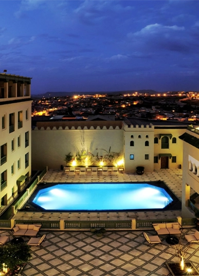A historic palace overlooking the medina. Its terraces face a sea of rooftops and minarets, capturing the gravity of Fes. Traditional interiors, Andalusian gardens, and a sense of old-world authority.